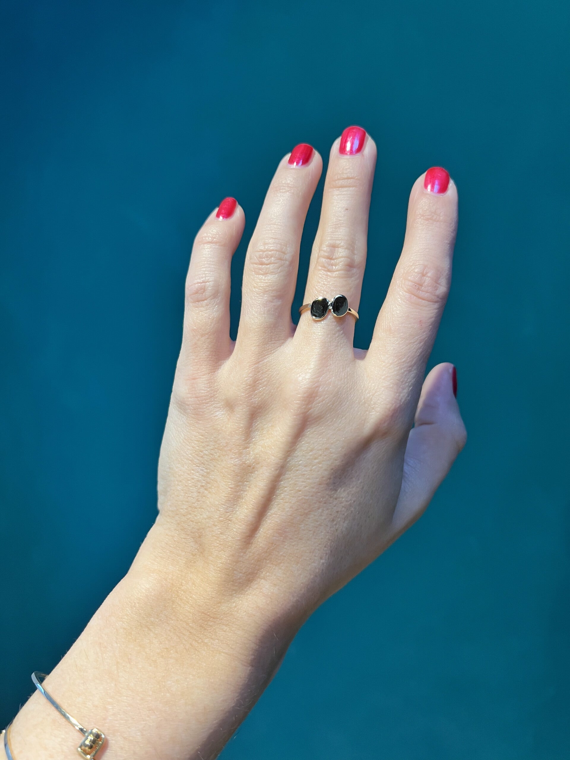 Een ring met twee glanzende pebbles op de band. Ik hou van de eenvoud van deze kiezelvorm op een ring! De pebbles worden zo gemaakt dat ze steeds een ietsje verschillend zijn om zo een speels efect te bekomen.